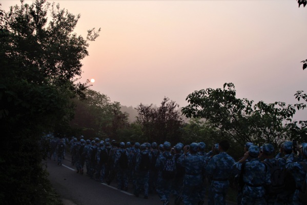 5時整,一聲嘹亮的“出發”劃破天際,各營隨即踏出了西操,踏出了校門,向著不遠的翠屏山進發!