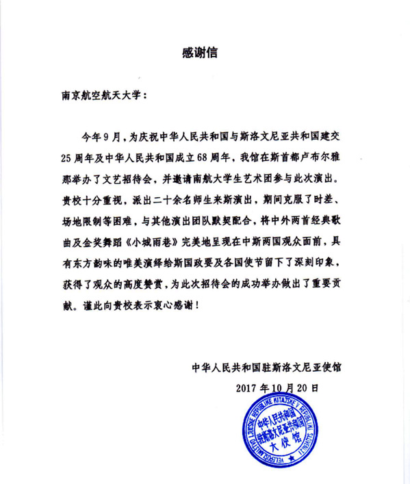 中國駐斯大使館感謝信
