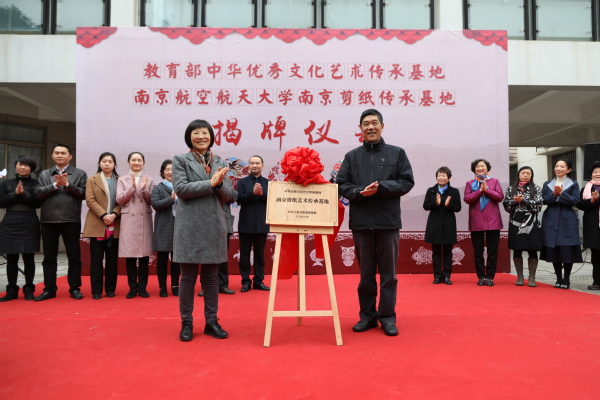 教育部體衛(wèi)藝司副巡視員萬麗君和江蘇省教育廳副廳長(zhǎng)朱衛(wèi)國為我校“南京剪紙傳承基地”剪彩